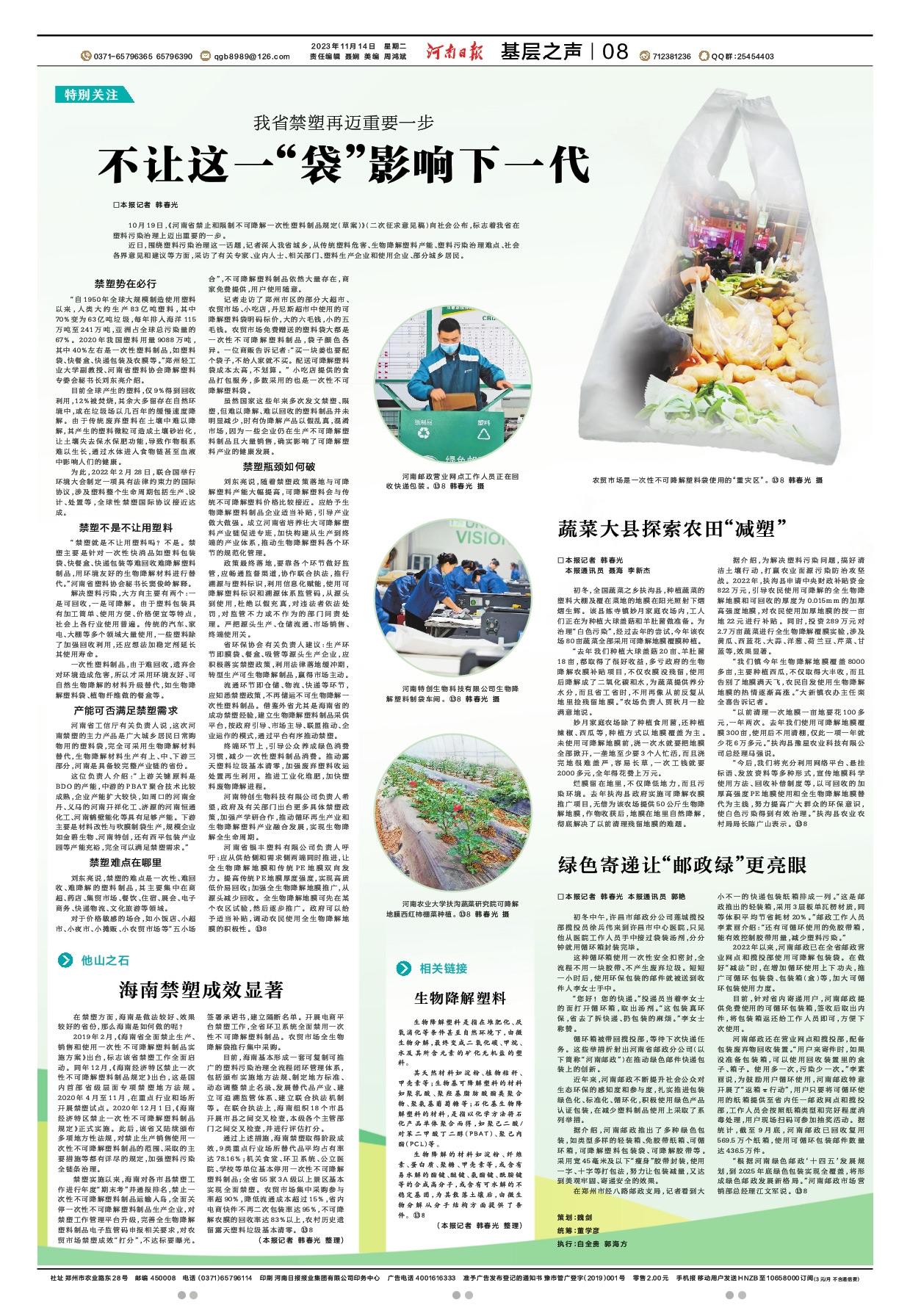 走進(jìn)河南特創(chuàng)生物科技公司可降解產(chǎn)業(yè)園的生產(chǎn)車(chē)間,整齊擺放的可降解垃圾袋、購(gòu)物袋等吸引了記者的目光。項(xiàng)目負(fù)責(zé)人介紹:“項(xiàng)目一期今年6月建成投用,公司產(chǎn)品涵蓋各類(lèi)生物降解改性樹(shù)脂及制品,埋在土里,在大自然微生物作用下,6個(gè)月可以全降解成水和二氧化碳,不僅能做到零殘留、零污染,還能增加土壤肥力,回歸大自然。”