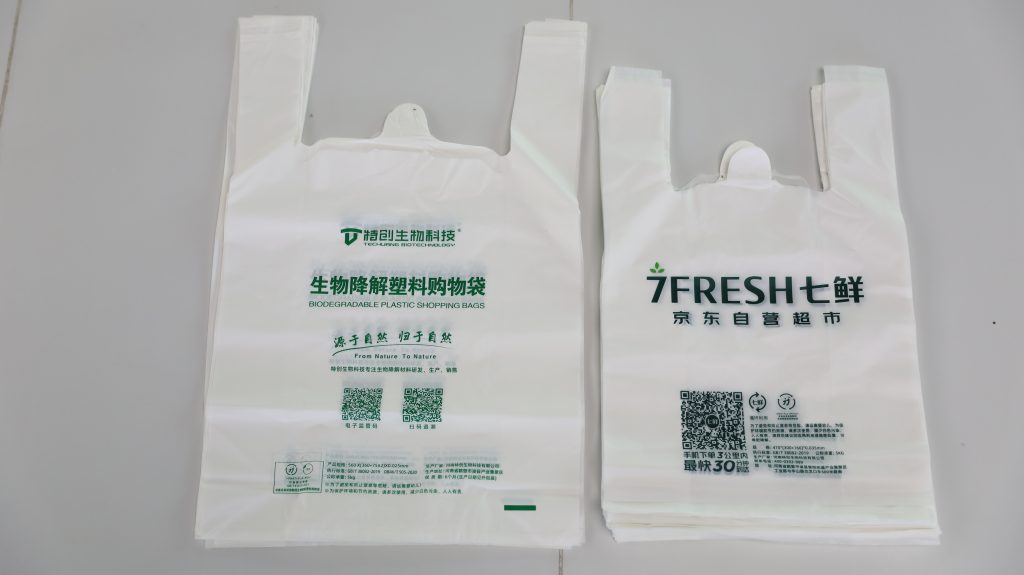 全生物降解購(gòu)物袋:采用全生物降解材料,如聚乳酸(PLA)和聚己二酸(PBAT)。這些材料在特定的環(huán)境條件下,能夠自然分解為二氧化碳和水,對(duì)環(huán)境友好。